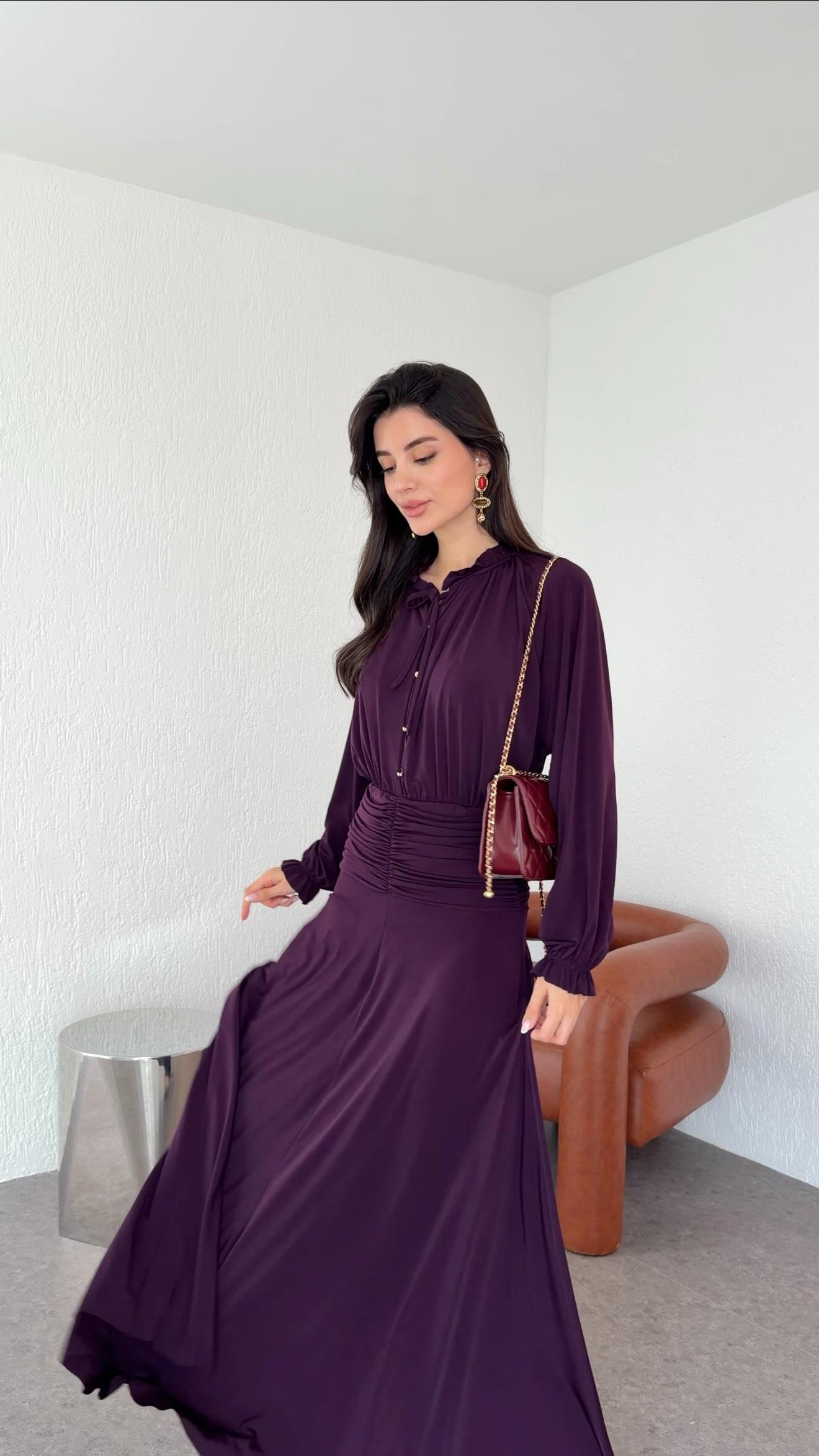 Fırfırlı Yaka Maxi Mürdüm Elbise
