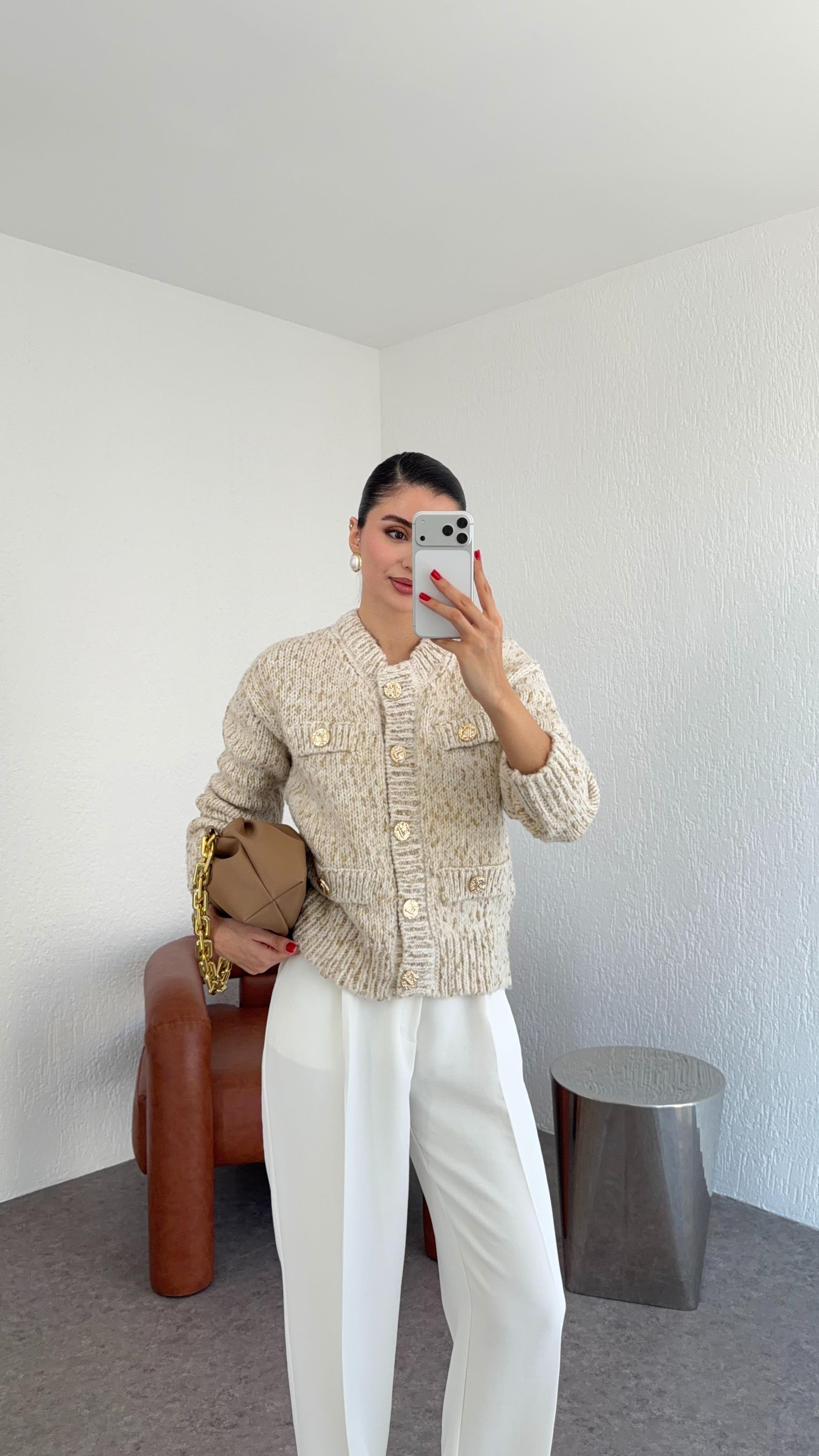 Gold Düğmeli Cepli Bej Premium Hırka