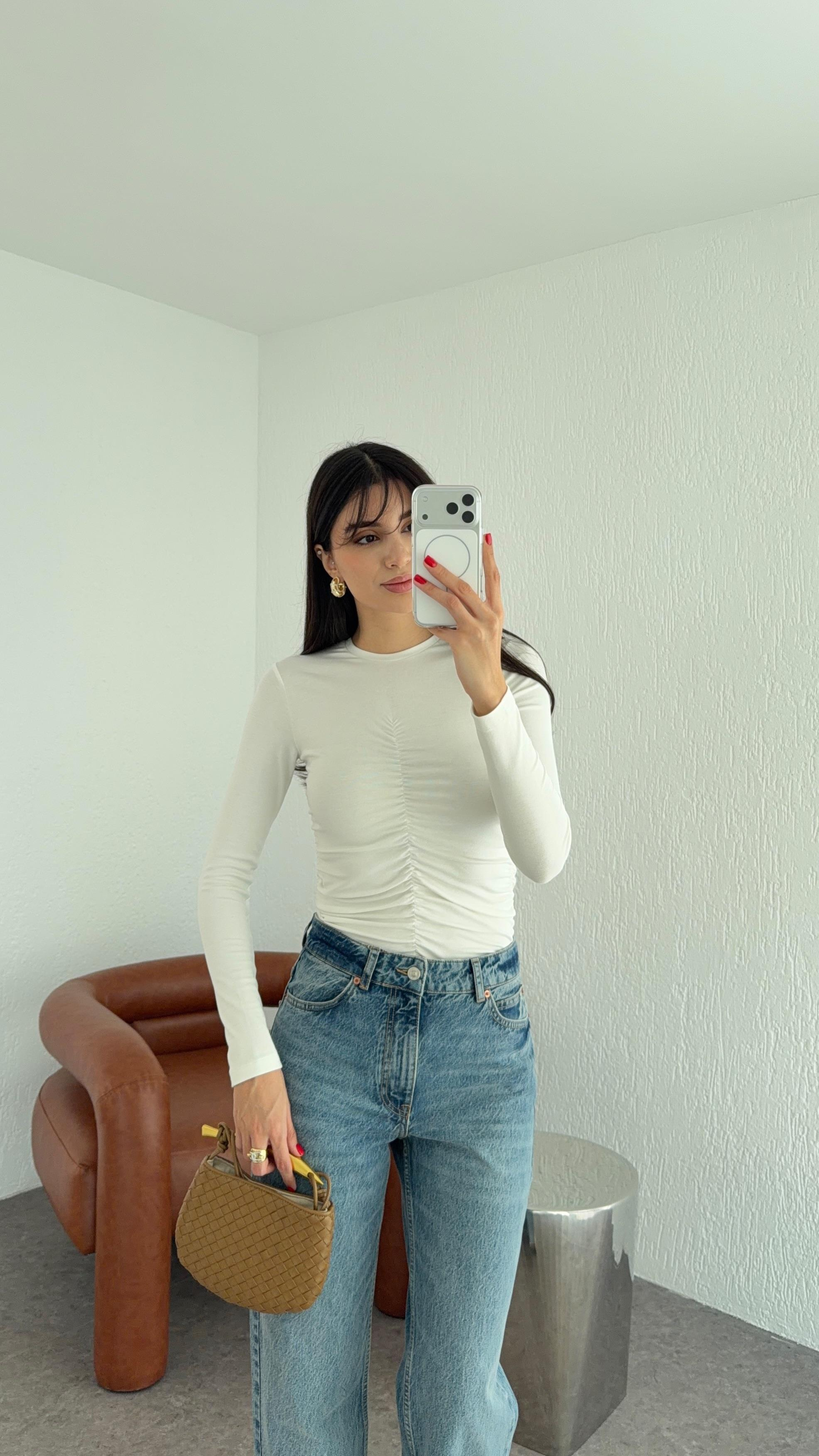 Önü Büzgülü Beyaz Soft Touch Bluz
